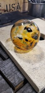 Recently I had the opportunity to have my own experience with hand blown glass at the Third Degree Glass Factory in St. Louis. This was such a unique experience and I learned a lot about glass creations. I chose to make an orb and was able to select my own colors and begin the process of melting the glass and colors together. The glass had to be repeatedly put into a 600 degree furnace to soften and blend the colors. There was a particular type of tool that was used to shape the glass. I had to blow air into the glass a few times to get it to the desired size.